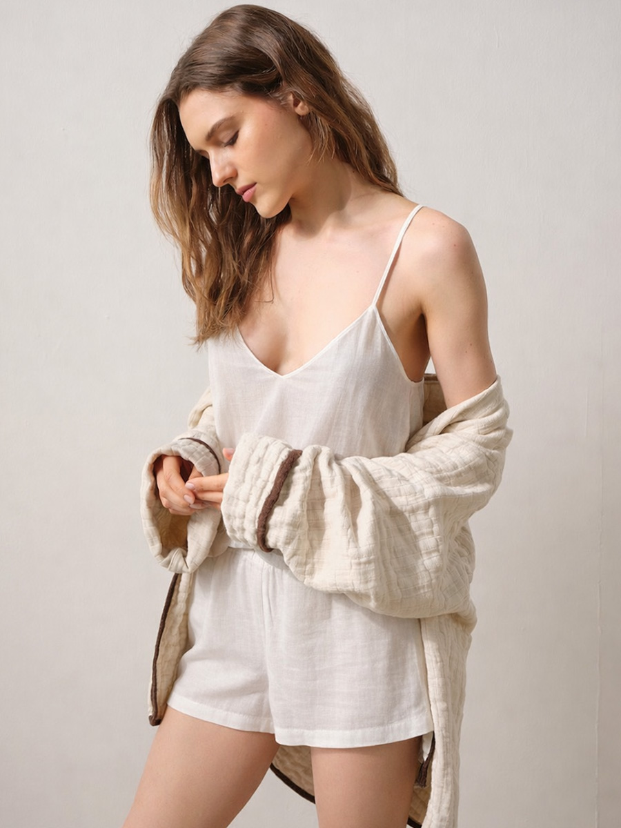 İnce askılı bluz. Kumaşı, doğal pamuk liflerinden dokunmuş, yok hissinde bir vualdir. Yaru koleksiyonundaki tüm pantolon, şort ve etek opsiyonlarıyla takımlanabilir.