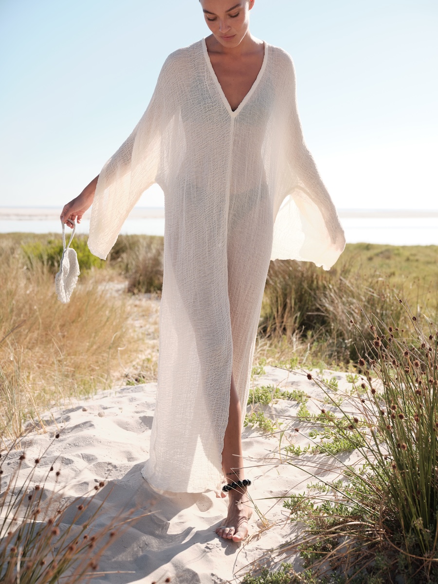 Kendine özgü dokulu hafif, uzun tunik. Sahilde mayo ve bikini üstüne giyilebilecek feminen bir parça.