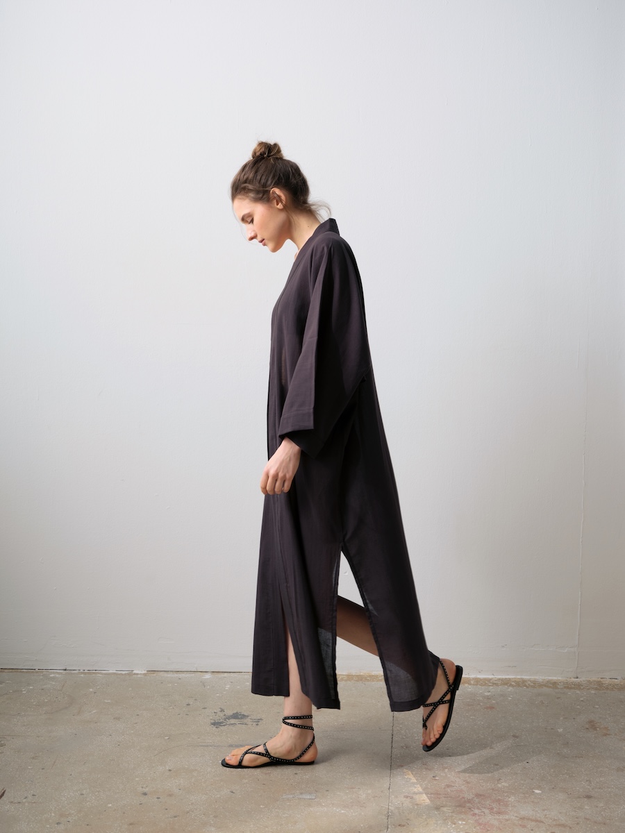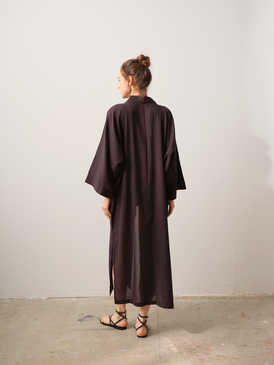 Uzun kimono. Kumaşı, doğal pamuk liflerinden dokunmuş, yok hissinde bir vualdir. Bedensiz. 34-44 bedene uyumludur.