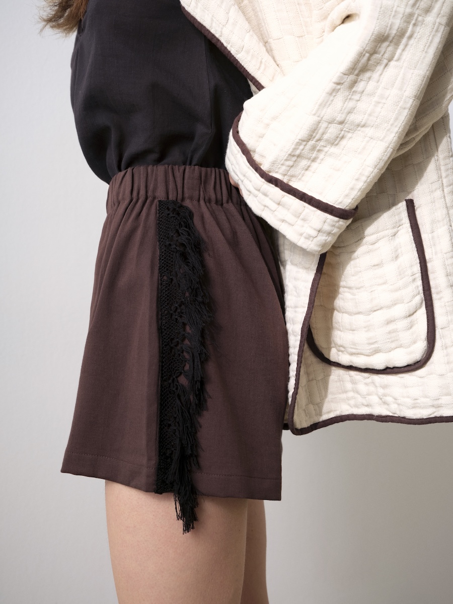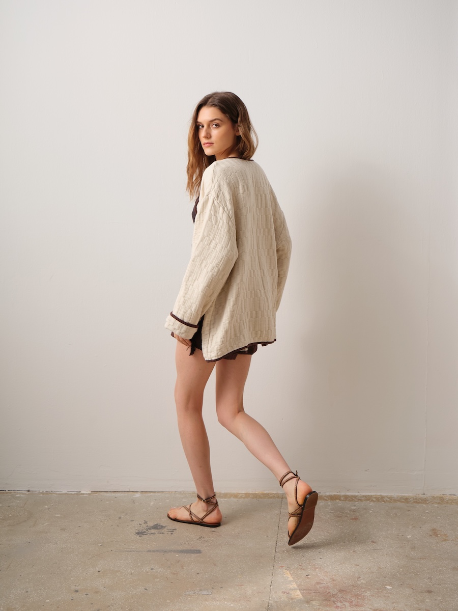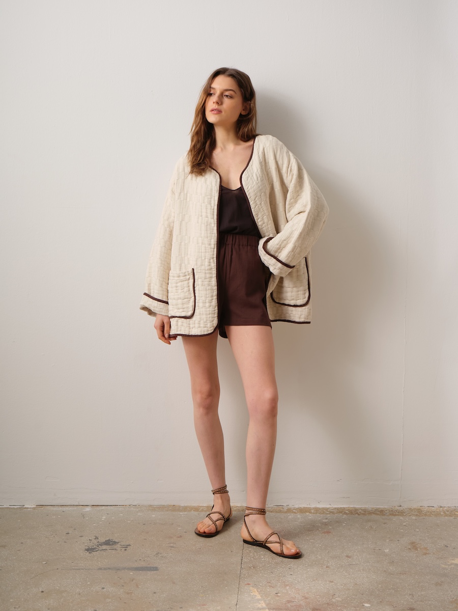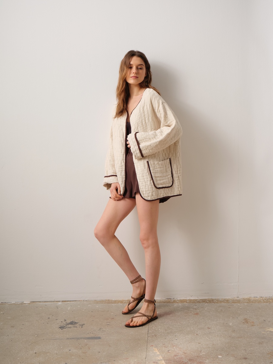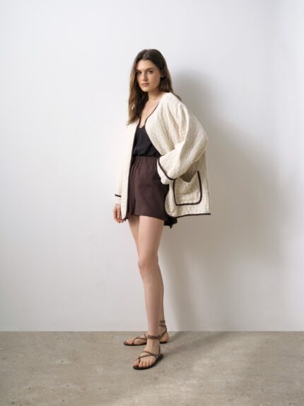 Serin yaz akşamlarında rahatlıkla kullanılabilecek kalınlıkta, pamuk jakar dokumalı ceket. İki farklı biye rengi opsiyonu vardır.