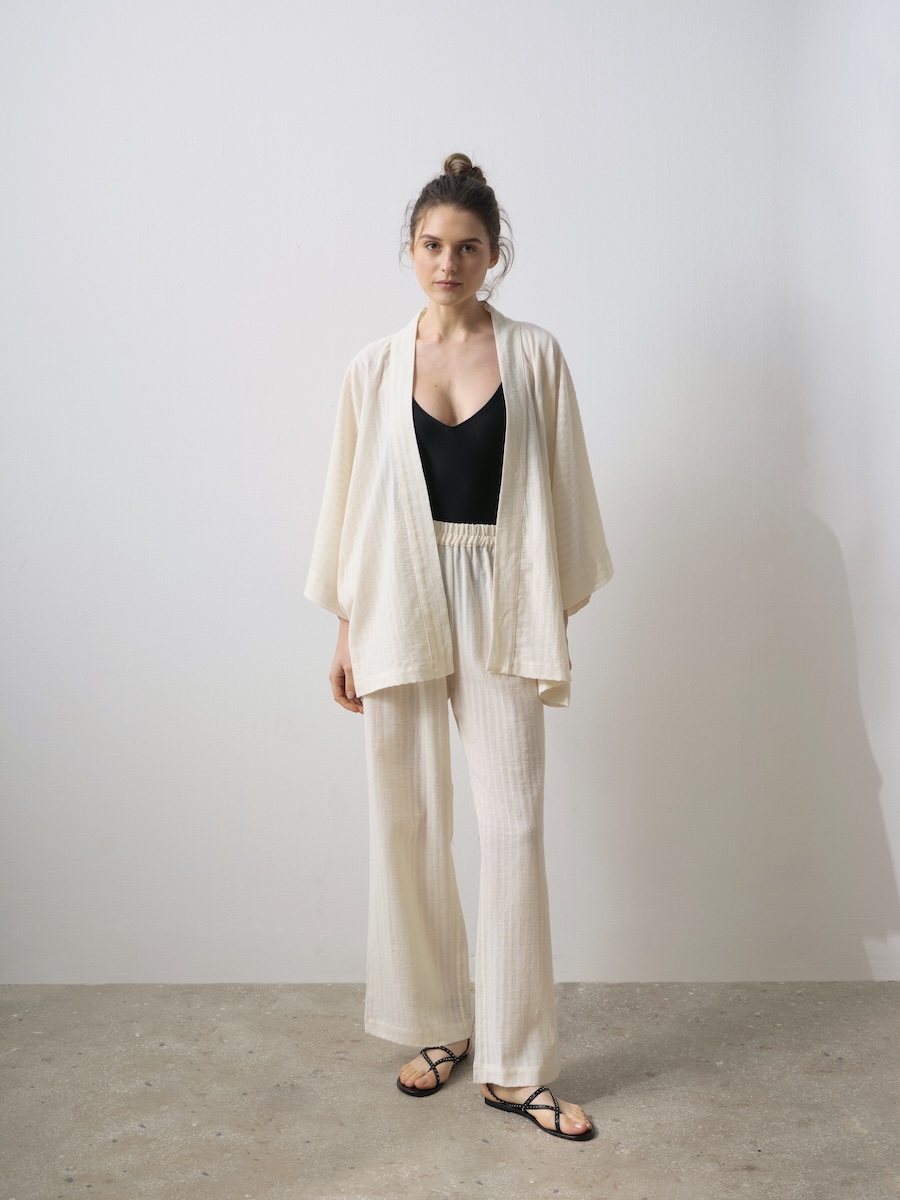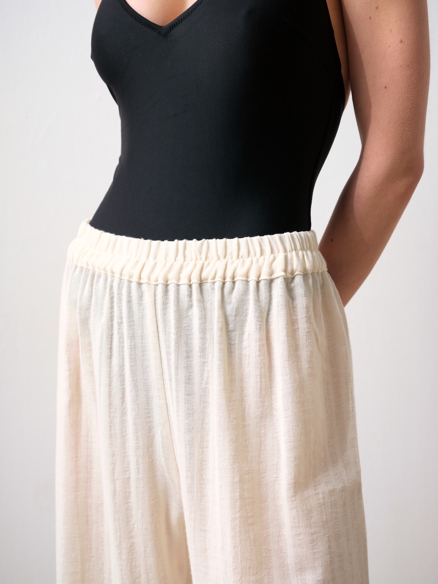 Beli lastikli pantolon. Kumaşı kendinden çizgili %100 Pamuk Retro Şile bezidir.
