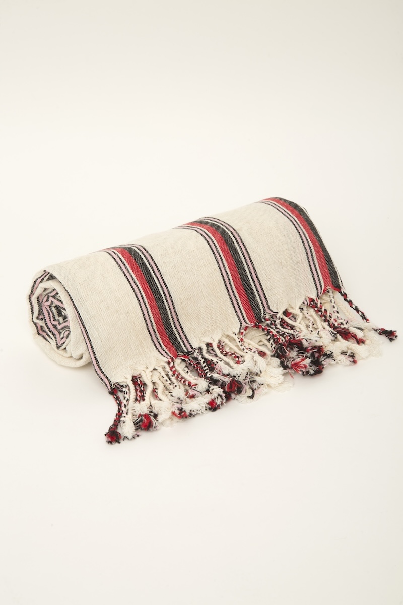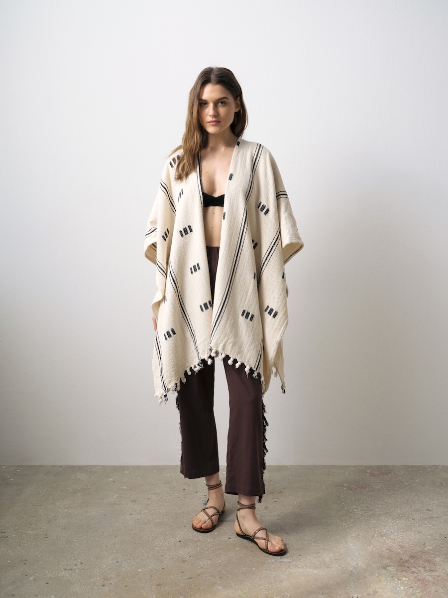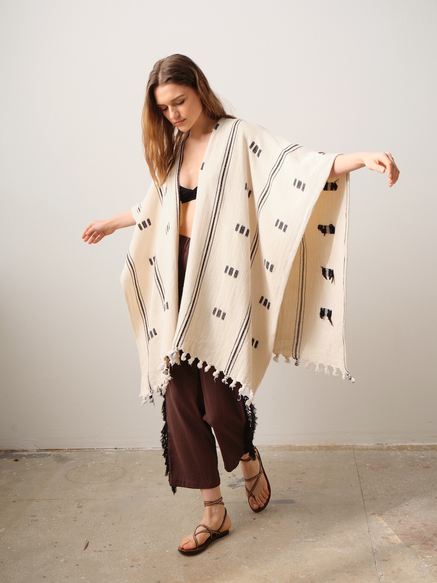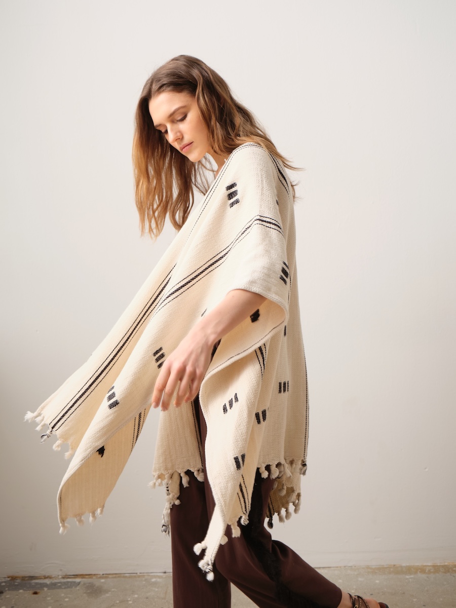 Orta boy, etekleri püsküllü, kendinden desenli panço.