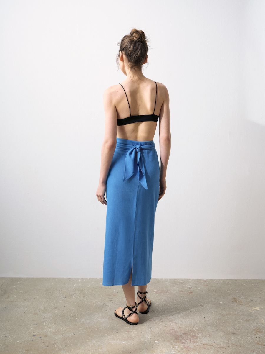 Yaru koleksiyonunun anahtar parçalarından biri olan Zamansız etek üç farklı şekilde giyilebilir. Uzerinde herhangi bir düğme veya fermuar yoktur. Bağlanarak vücuda göre ayarlanır. Rahatlıkla sahilden geceye taşınabilir.